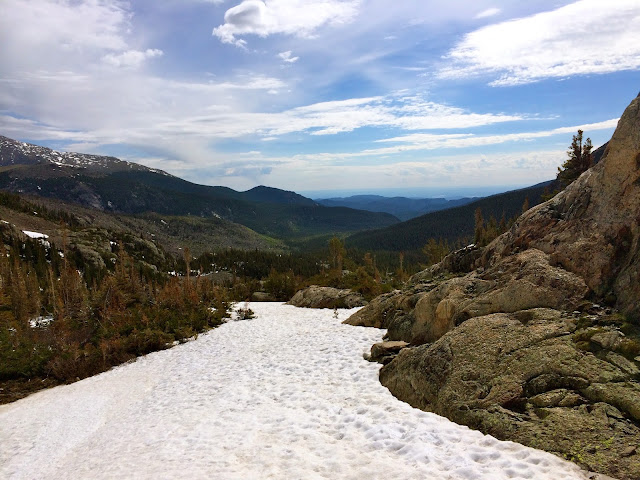 A couple Sundays back, I got up before dawn and drove to the mountains. Specifically, the Wild Basin section of Rocky Mountain National Park about an hour and a half outside Denver. I hiked along St. Vrain's Creek to Ouzel Falls then through snowfields, forests, and canyons to Bluebird Lake at the base of Ouzel Peak. The lake was only just beginning to thaw. Hulking peaks including Longs and Meeker loomed in the not too distance. By the time I finished the 13 mile hike five and a half hours later, the trailhead parking lot was full. I've learned getting there early is the secret to enjoying the scenery in Colorado.